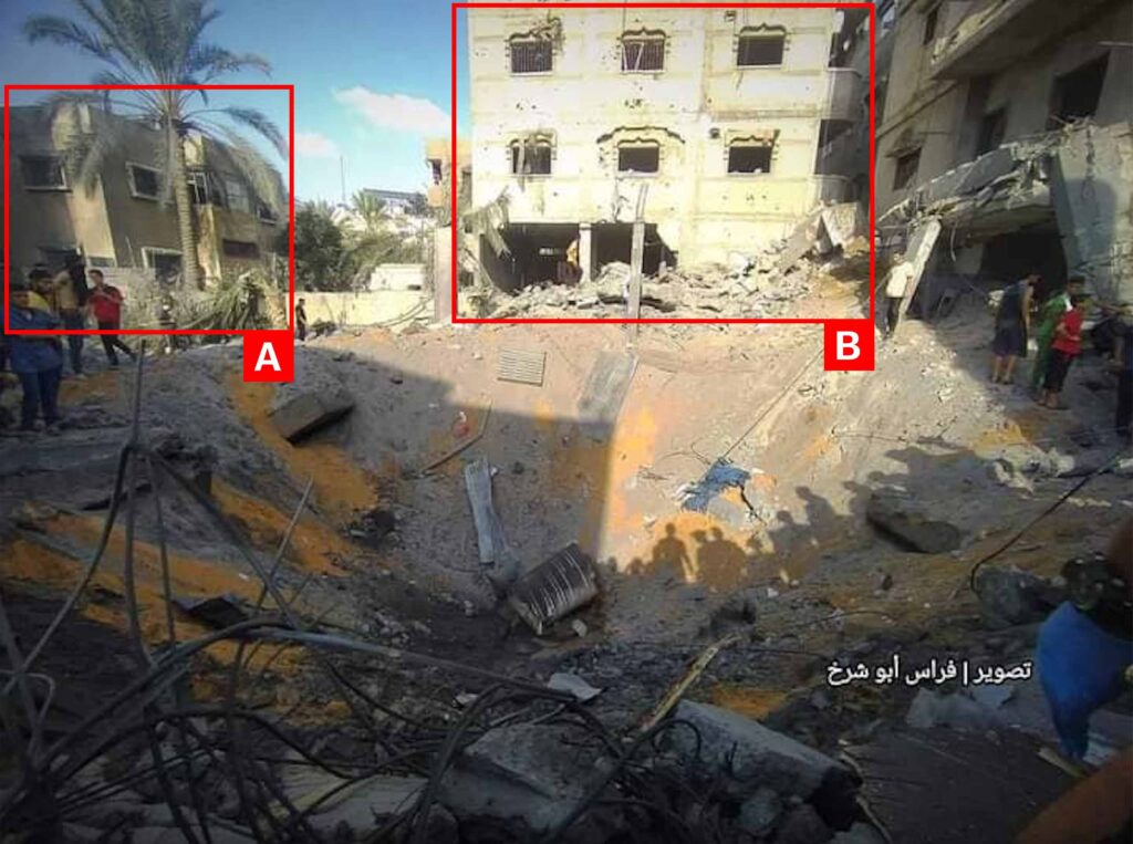 Images of the aftermath of the incident, taken by Fares Abu Sharakh, show the scale of the destruction. A large sandy crater can be seen alongside significant damage to the neighbouring buildings.