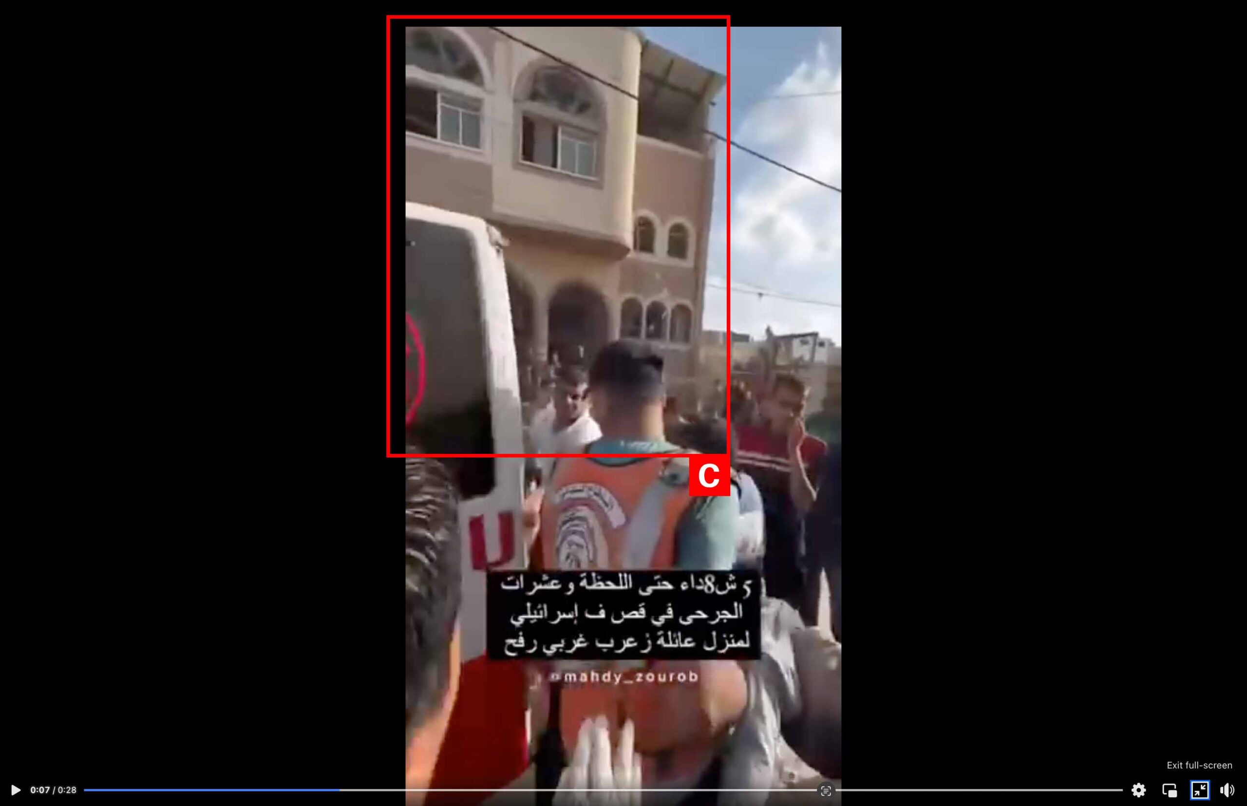 Reports of the incident mention a residential building being struck in the vicinity of the Al-Aqsa Petrol Station (محطة الاقصى للبترول) to the west of Rafah City (رفح). Analysing audio-visual material from sources, we have narrowed the location down to the following exact coordinates: 31.293895, 34.246122.