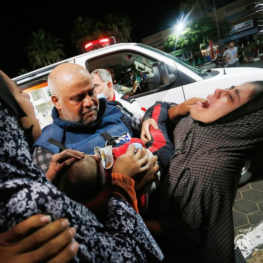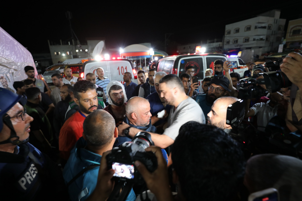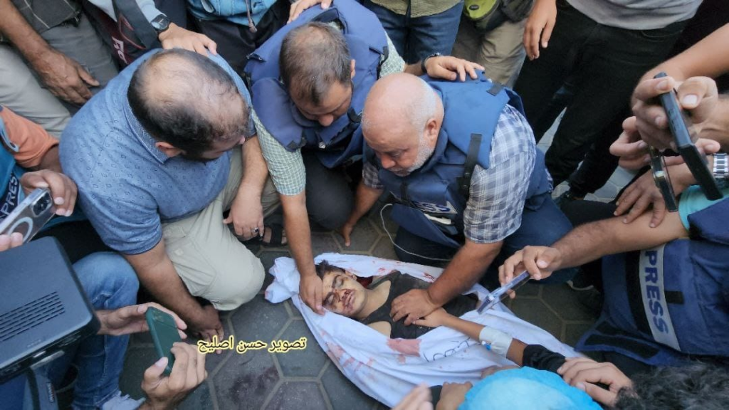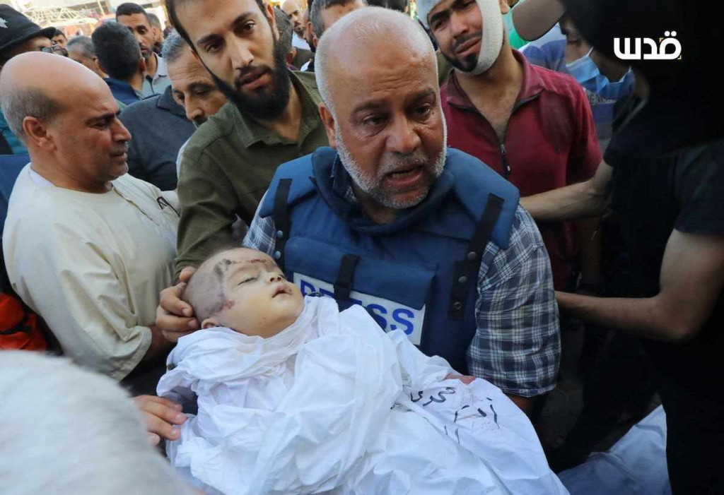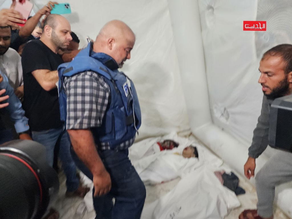 During an Al Jazeera Egypt news report, reporter Hisham Zaquot narrated as footage of Wael Al-Dahdouh walking through the Al-Asqa Martyrs Hospital in Deir al Balah to find his family members was broadcast.
