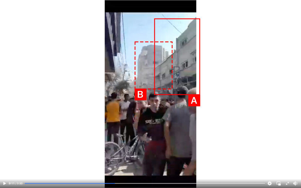 Reports of the incident mention a residential building being struck in the vicinity of the Abu Rasas roundabout (دوار أبو رصاص) in the Al Bureij refugee camp (مخيم البريج). Analysing audio-visual material from sources, we have narrowed the location down to the following exact coordinates: 31.438485, 34.402320.