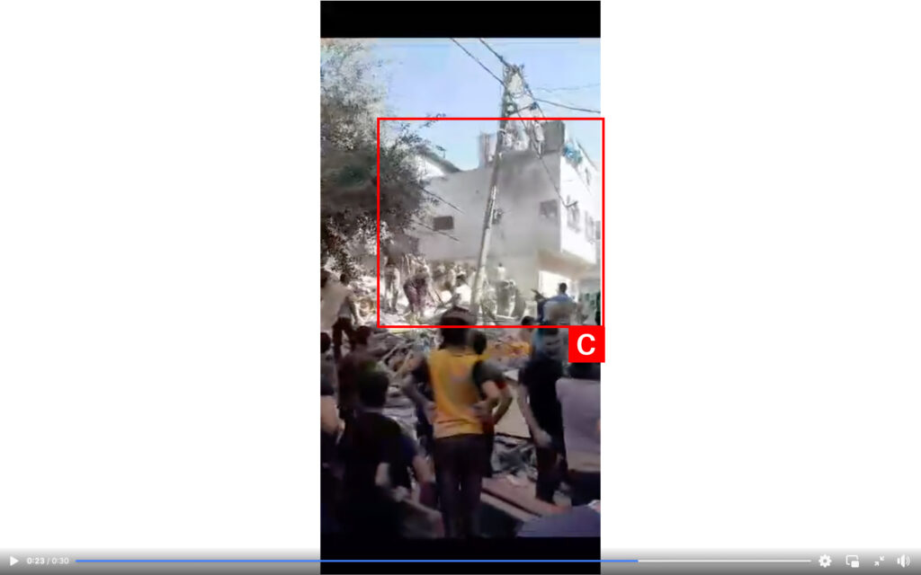 Facebook user Khamis further posted a video depicting the destruction of the Al-Mabhouh’s house, which has been reduced to rubble. Civilians are gathered in the street around the site of the incident and others can be seen attempting to free the injured trapped under the rubble. A number of children walk away from the destruction covered in a thick layer of dust. The video shows a fire engine on the street near the site of the incident.