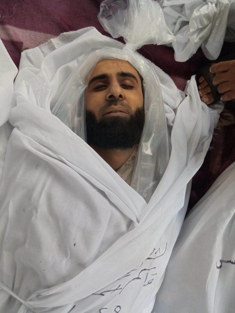 Mourning relatives, including Qasim’s brother, Hani Abu al-Saud, and Qasim’s cousin and Musa’s uncle, Mohammed Abu Saud, shared tributes on Facebook. Mohammed noted that “there was a bombing that targeted our homes in Al-Shaboura Camp.” These posts included images of the victims: Qasim, with neatly combed dark hair and a beard, and Musa, a young man with a trimmed beard, wearing a fitted t-shirt and a green camouflage-patterned cap.