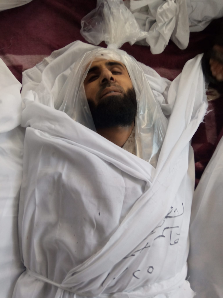 Other tributes from Qasim’s cousins, Nedal Al-Ghazzawi and Islam Abu al-Saud, included a graphic image of Qasim’s body and pale face wrapped in a plastic bag and white cloth. In another post, Islam shared a video of a man whose clothes and body were ashen and covered in rubble, being carried on a stretcher by volunteers and first responders. Based on the beard and grey shirt seen in the earlier images, the man on the stretcher may have been Qasim.