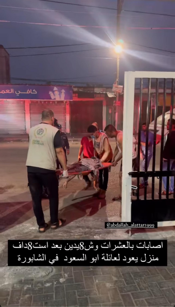 Between the night of Tuesday, October 24, 2023, and the early hours of Wednesday, October 25, 2023, an alleged Israeli airstrike struck the Abu al-Saud family home in al-Shaboura Camp, central Rafah. The bombing killed at least two men, 31-year-old Qasim Ismail Musa Abu al-Saud and 21-year-old Musa Khaled Khalil Abu al-Saud, and up to eight civilians, and left dozens of others injured while also destroying the building.