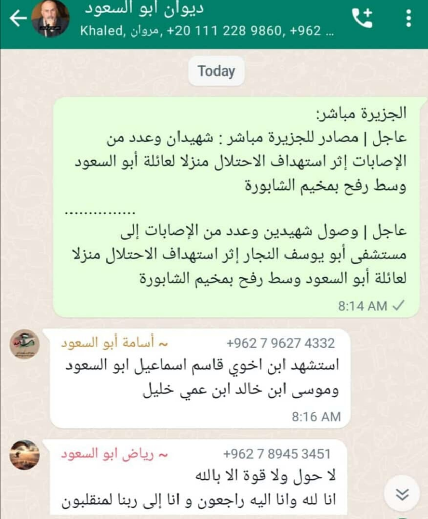 While the official Abu al-Saud family Facebook account commemorated “those who died yesterday…on Tuesday [October 24, 2023],” other sources, including SAFA, the Palestinian Press Agency, reported that the bombing continued until noon on Wednesday. A SAFA correspondent first reported Qasim and Musa’s deaths at approximately 7:55 AM on Wednesday.