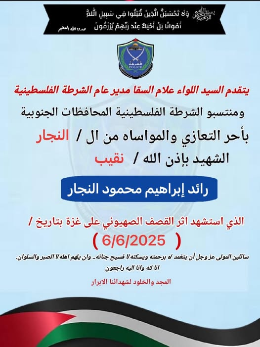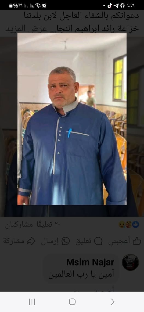 Naji Al-Najari shared a Quranic verse in his memory: “And We will surely test you with something of fear and hunger and a loss of wealth and lives and fruits, but give good tidings to the patient” (Al-Baqarah 2:155). The Al-Najjar family announced his death, describing him as a kind-hearted man. The post included a photo of him, showing a middle-aged man with a round, full face and closely cropped hair, posing seriously while wearing a traditional blue thobe.