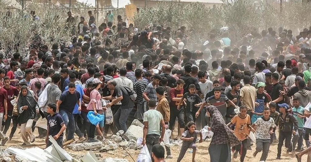 Pictures showing the aftermath of the incident were shared widely across social media. They showed a large crowd gathered to receive aid, fleeing from gunfire with empty plastic bags in their hands.