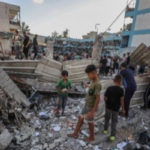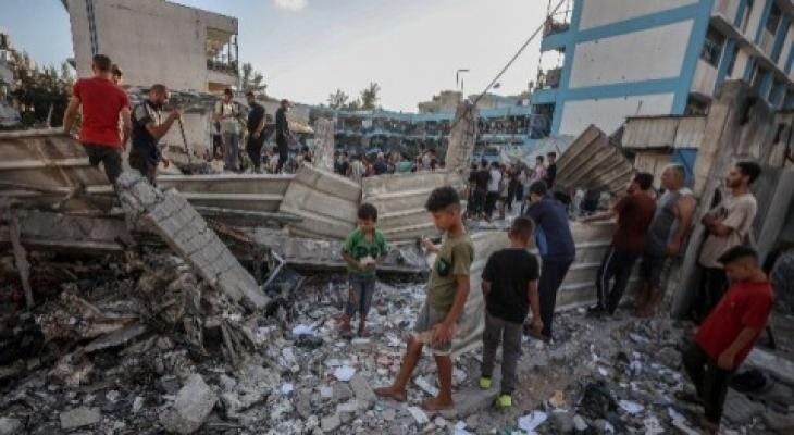 SHFA news shared an image of people gathered around the destruction site amidst debris and rubble. Al Hawyah news channel shared an image of a young man standing next to a pile of rubble in the schoolyard.