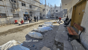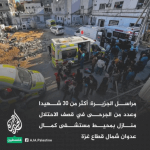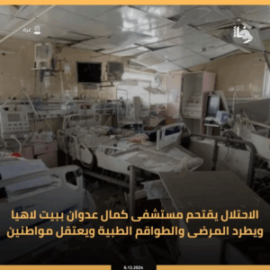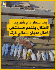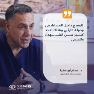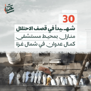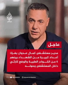 Salah Abdalat described the events that happened: in the morning, the Israeli forces “launched a large-scale ground and air attack in the vicinity of Kamal Adwan Hospital, which lasted for several hours, before withdrawing from the area, leaving behind an initial toll of widespread destruction and nearly 50 martyrs, including 4 medical staff at Kamal Adwan Hospital, and dozens of wounded and missing, by targeting homes in the vicinity of the hospital.”