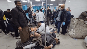 A tweet from @MyPalestine0 showed “the scene in the yard of Kamal Adwan Hospital” with an image of at least 15 bodies wrapped in shrouds, some of them small and possibly children. In a video published by Al Jazeera (@ajmubasher) beginning with a similar scene, men can be seen moving bodies wrapped in shrouds in the courtyard and later shows the inside of the hospital with injured victims on every free space of the floor.