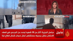 Safa News reported at 8:58 a.m. that “more than 30” people had been killed and a number of others had been wounded when homes around Kamal Adwan Hospital were bombed by Israeli forces. A Facebook post from Rami Almozanen stated that the raid of Kamal Adwan killed more than 50 people “inside the hospital, including four people from the medical staff”.