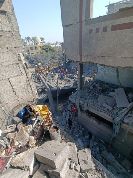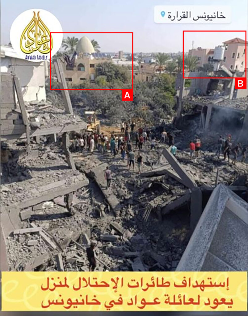 A Facebook account for the extended al-Awad Family shared a video taken in the aftermath of the alleged strike, showing the immense destruction as a crowd of people gathered at the site and searching through the scorched rubble. The post caption states that “with hearts filled with faith in God’s will and destiny, the Awad family at home and abroad mourns its martyrs”. Abdelrahman Zaher posted about “the martyrdom of my cousin, Muhammad Maher Awad, and his sister, Noha Maher Awad” and subsequently shared that “their mother/Umm Haitham Awad has now joined them.”