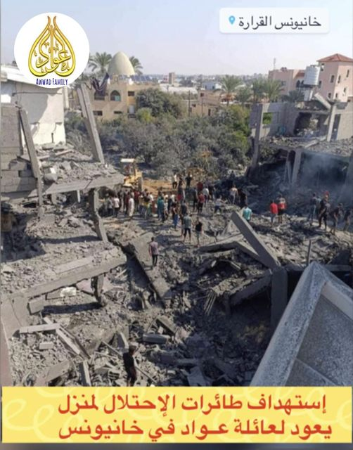 On Twitter/X, @shaabradio announced that casualties had resulted from a strike on “a house belonging to the Awad family.” Basmeh al-Farra also reported on Twitter/X that “a number of those injured were transferred from the targeting of an entire residential square to the Abu Awad family, al-Astal, and another family, and… martyrs and injuries were transferred from the place.” According to a post on Facebook by Ghada Elhenawy, at least one killed civilian arrived at Nasser Medical Complex after bombing of the Awad family home.
