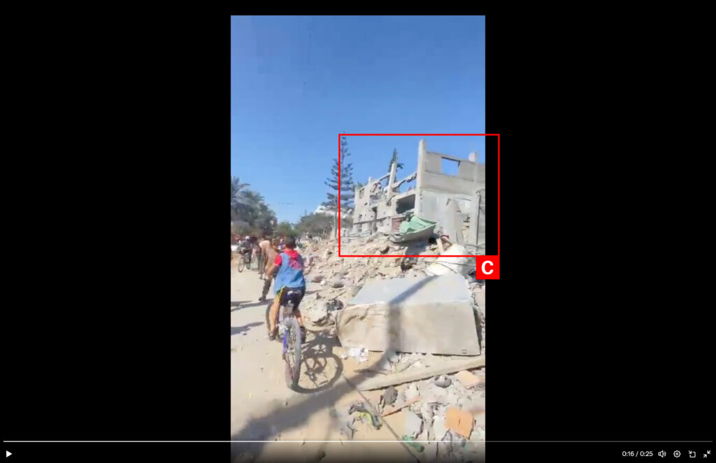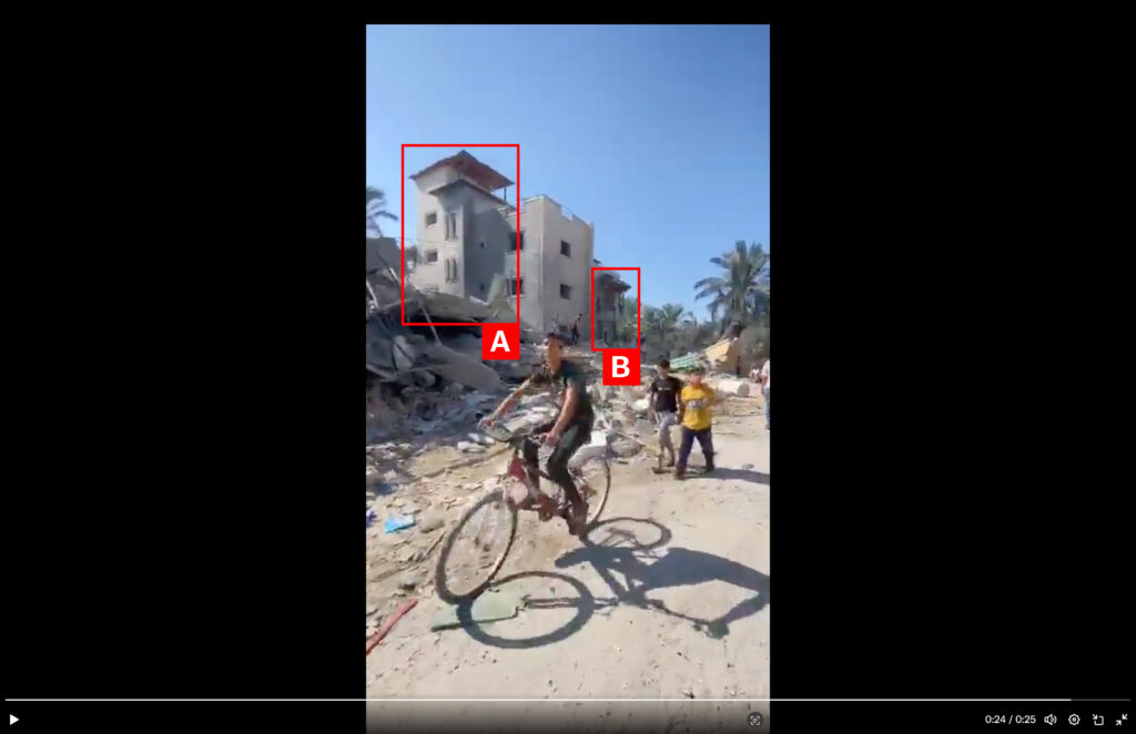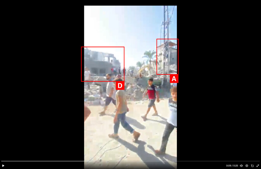 Reports of the incident mention a residential building being struck in the Al Satar Al Gharbi area (السطر الغربي) to the north of Khan Younis (خان يونس). Analysing audio-visual material from sources, we have narrowed the location down to the following exact coordinates: 31.357327, 34.312153.