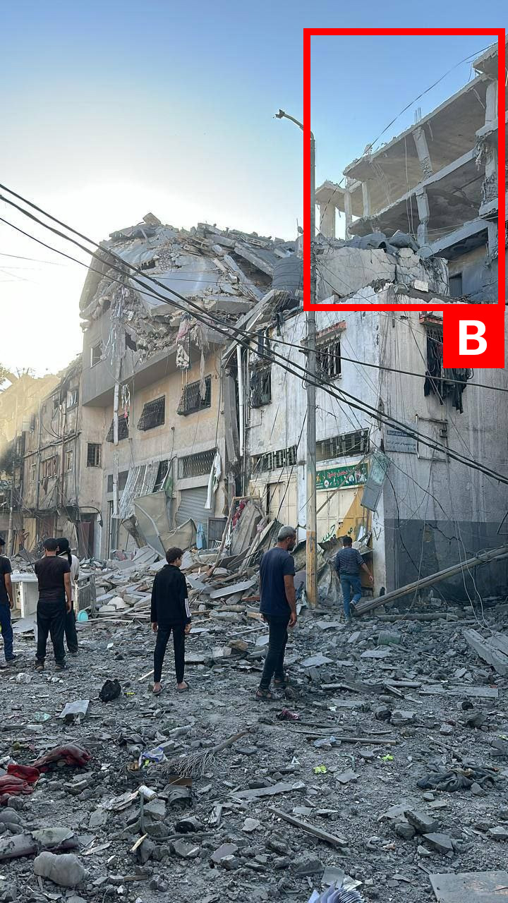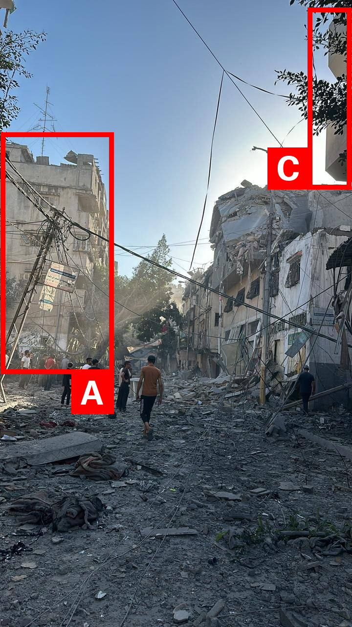 Reports of the incident mention a residential building being struck in the vicinity of the Askola Junction (عسقولة) in the Al-Zeitoun neighbourhood (الزيتون) to the south of Gaza City (مدينة غزة). Analysing audio-visual material from sources, we have narrowed the location down to the following exact coordinates: 31.500048, 34.455340.