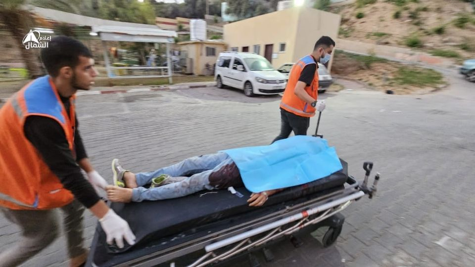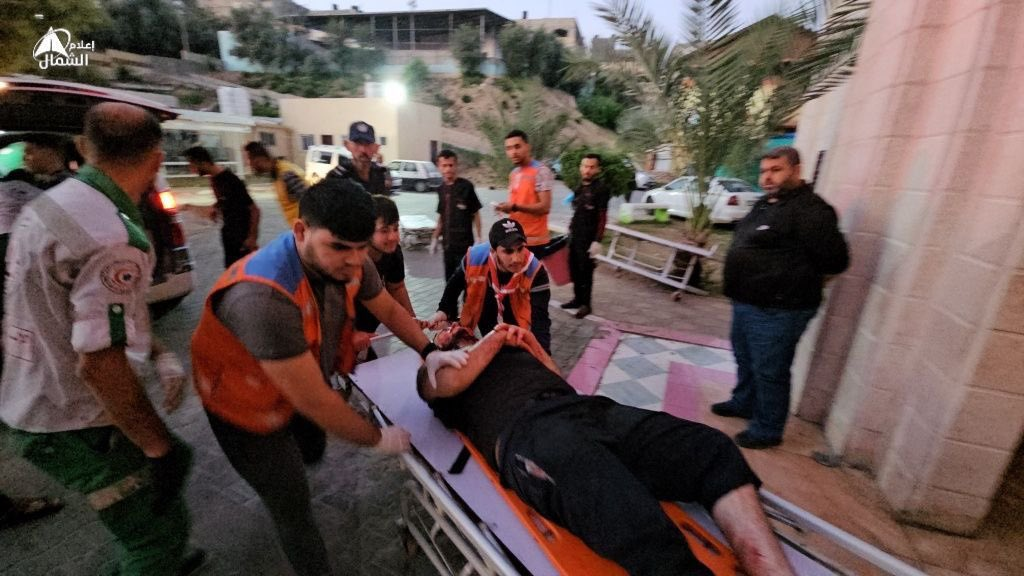 At 7:13 am, the Palestinian Press Agency (Safa.ps) reported “a number of injuries as a result of the [Israeli military’s] bombing of the Abu al-Jadaran roundabout area in the Beit Lahia project in northern Gaza.” A video posted on Facebook by Maher al-Hijazi shows two men with severe injuries arriving at a hospital on stretchers, with the time being noted as “6:48 am.” Al-Jazeera Palestine shared the same video of the injured men on Twitter.