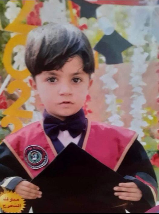 A photo of a little boy holding a graduation cap, dressed in a bowtie and gown was shared by Hanaa Mahmud on Facebook. The little boy was identified as Basem, son of Abeer and Muhammad. According to the post, Basem’s body was buried without a head as his head was thought to still be under the rubble.