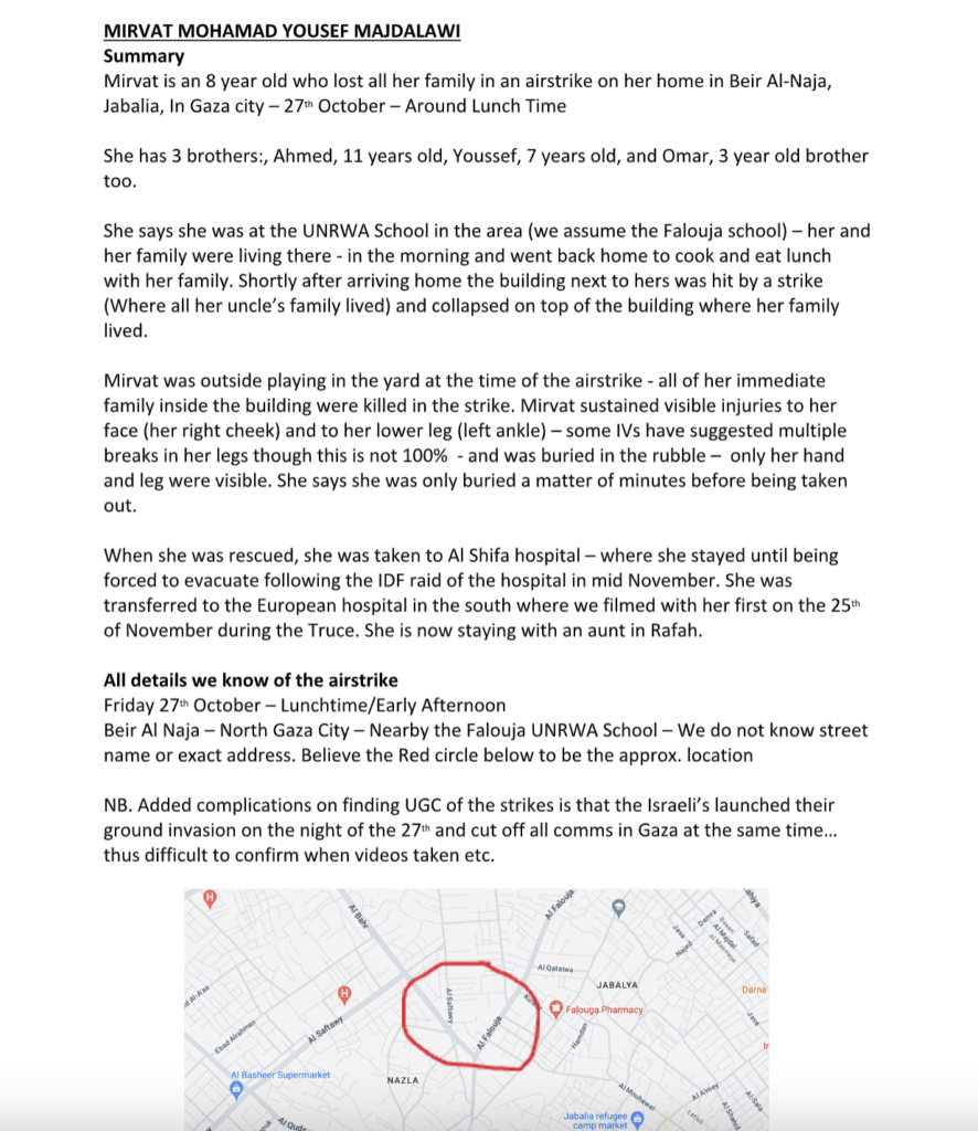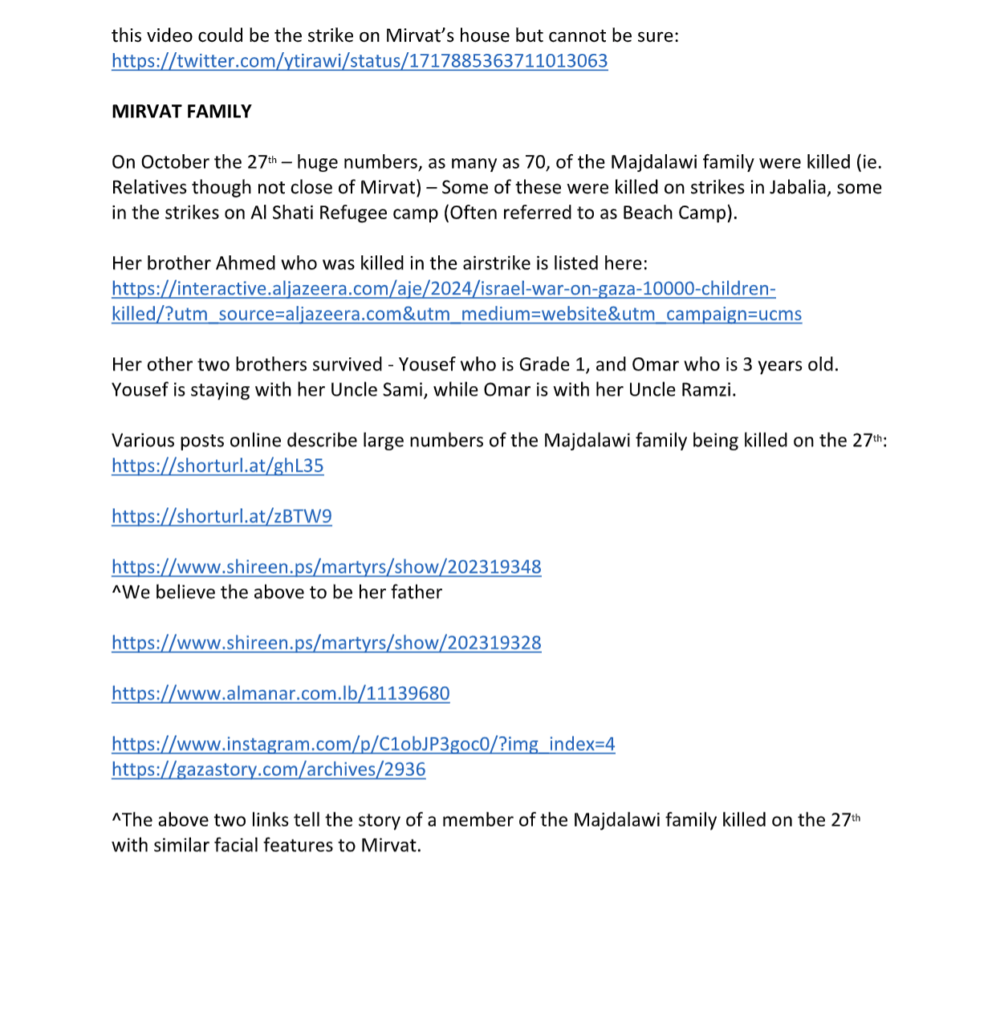 A private source reported to Airwars that an eight-year-old girl named Mirvat Mohammed Youssef Al-Majdalawi had been injured in the incident after returning home for lunch in the middle of her school day. Shortly after arriving home, the neighbouring house, which belonged her uncle, was reportedly hit by an airstrike, collapsing onto her family home. Mirvat’s brother 11-year-old Ahmed Mohammed Youssef Al-Majdalawi was killed in the incident alongside many other relative who were in the affected homes. The private source reported that Mirvat’s father 36 or 37-year-old Mohammed Youssef Abdel Karim al-Majdalawi was also killed in the incident.