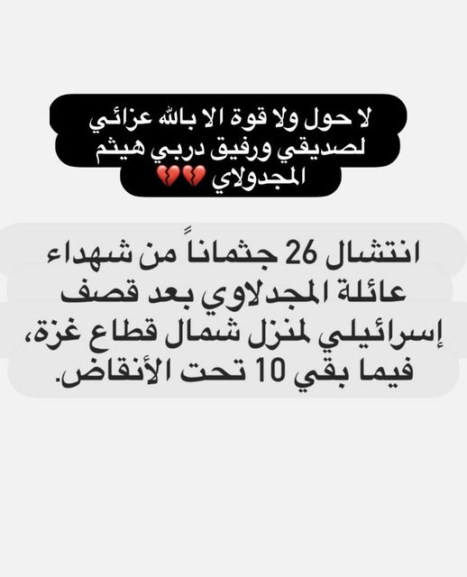 The house, located near the Abu Ali Mustafa roundabout, was significantly damaged; a video from Twitter/X user @FTaneneh shows major destruction, with people carrying on bedsheets the wounded and deceased from under the rubble. A family member, Waleed al-Majdalawi, declared that in addition to the 26 members of the family who were killed, 11 people were still under the rubble. Similarly, Shehab Agency reported that in addition to the 26 recovered, 10 bodies remained under the rubble following the incident.