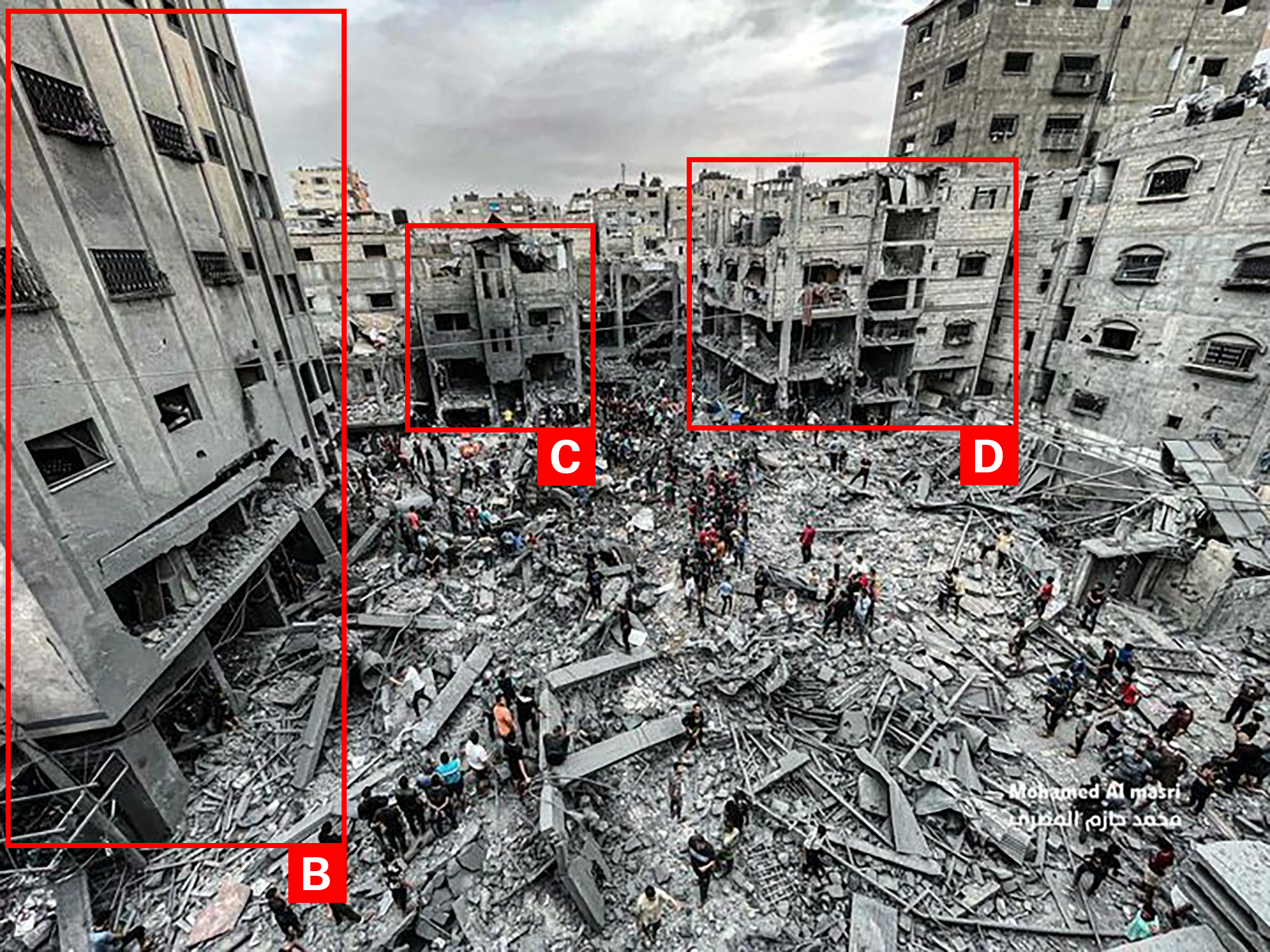 A number of videos and images were posted on social media depicting the aftermath of the strike. Mohamed al-Jobairi posted a video on Facebook showing a large column of black smoke rising from Hamid street, although the scene of the strike itself is obscured by buildings. Meanwhile, a video posted on the al-Shati Camp Facebook page, also shared by multiple other sources, including Qatari News Agency al-Jazeera, showed the aftermath of the strike. The video depicted a large area of completely destroyed buildings among which tens of people, including rescue workers, search the rubble for those trapped or buried beneath.