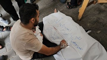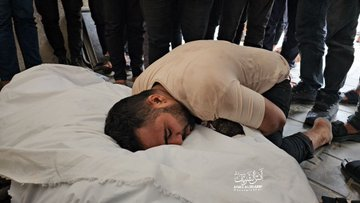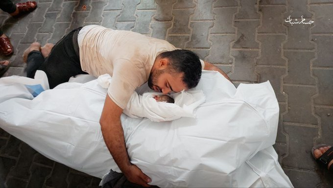 In a video shared by the Jerusalem Compass, the lawyer Jihad al-Kafarneh is seen crying as he holds the dead body of his newborn child, Musk Jihad al-Kafarneh. It was reported that his wife was also killed in the bombing the same morning. “The last hug!” – Almanara Media posted the image of Jihad lying next to his newborn daughter, who was “was not more than six days old”.