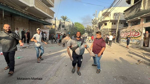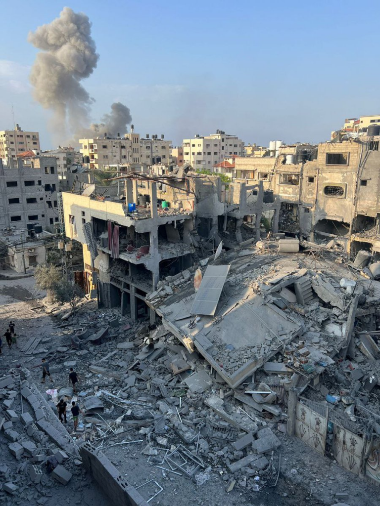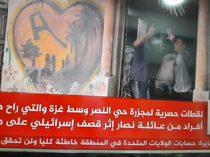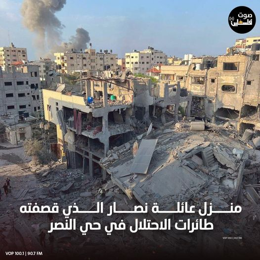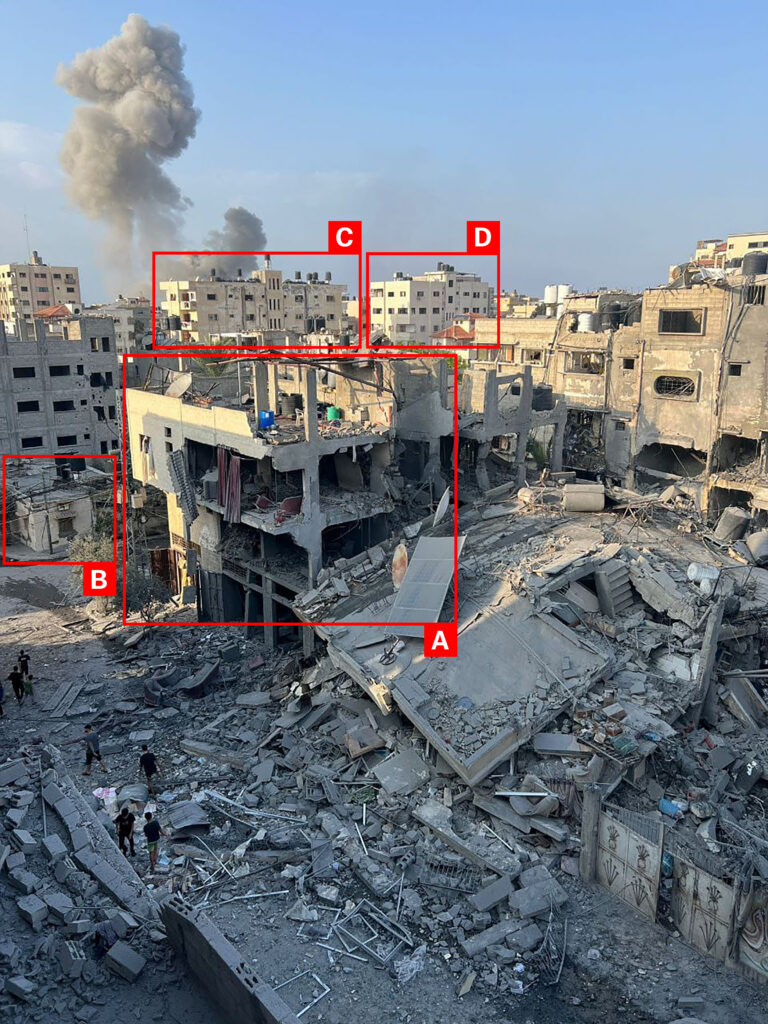 According to several sources including Sky News Arabia and Al-Jazeera Egypt, the multi-story residential building of the Nassar family in the Al-Nasr neighbourhood was completely destroyed by the airstrike, while a tweet from @M_Alzanin mentioned that “three residential homes” were struck. As depicted in videos and reported by sources like Sky News Arabia and The Palestinian Archive, neighbours carried out a rescue mission by pulling out civilians from under the rubble and carrying them to a nearby car because they were unable to call an ambulance or the civil defence crew, due to the [Israeli forces] cutting off communications.