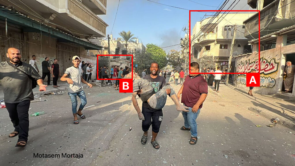 Reports of the incident mention a residential building being struck in the Al-Nasr neighbourhood (النصر) to the west of Gaza City (مدينة غزة). Analysing audio-visual material from sources, we have narrowed the location down to the following exact coordinates: 31.531561, 34.451658.