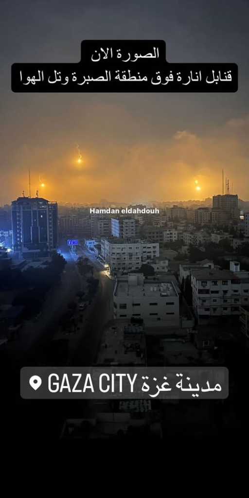 One photo posted by journalist Hamdan Al-Dahdouh showed the scene of “flare bombs” (illumination bombs) in the sky over the neighbourhoods of Al-Sabra and Tal Al-Hawa at the time of the strikes.