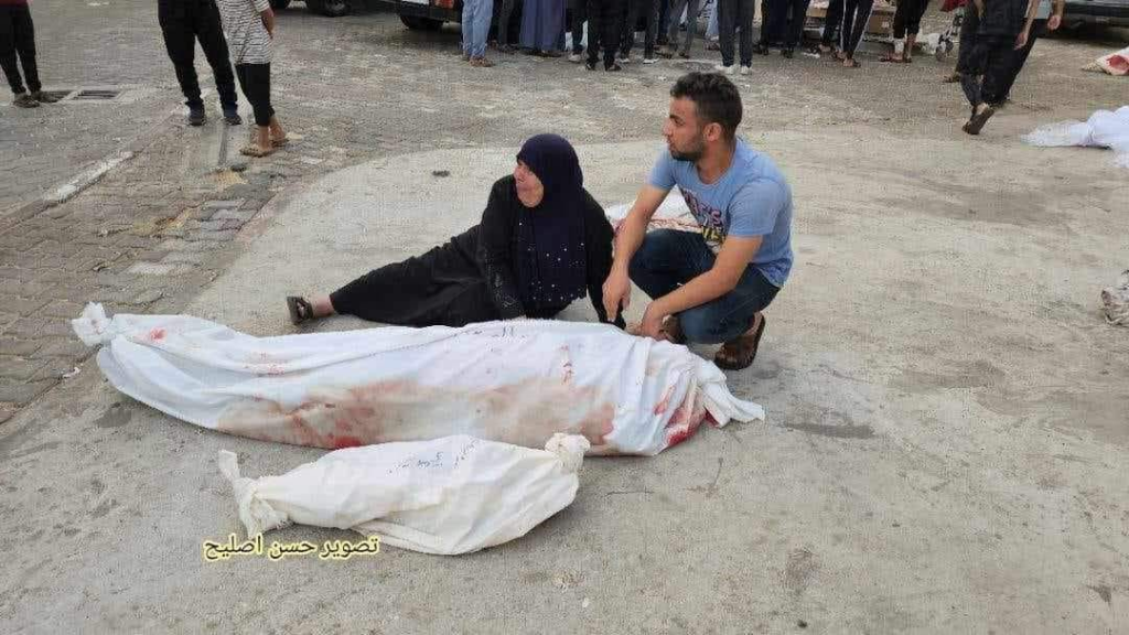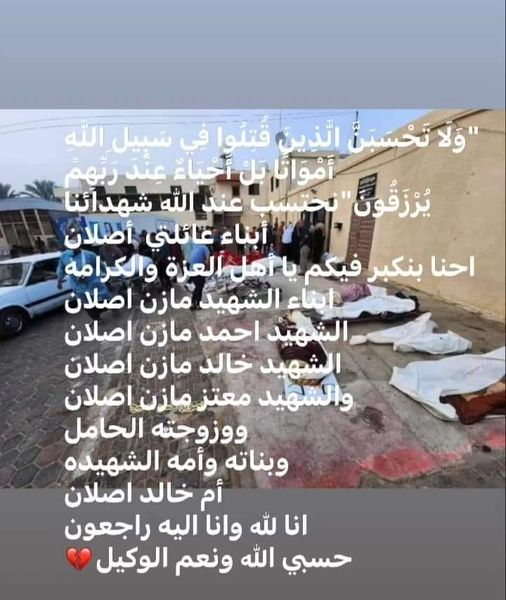 Khamis Hussein posted an image of “the Aslan family members” who were killed – likely Khaled, Ahmed, and Moataz – pictured at a formal event in suits. According to Suhail Sokkar, Ilham’s husband and Khaled, Ahmed, and Moataz’s father Mazan Aslan had died before the attack, so that his family was now “united” with him. Images included in Suhail Sokkar’s post show multiple bodies wrapped in shrouds, and in one image, an elderly woman and a young man are seen mourning the bodies of an adult and child.
