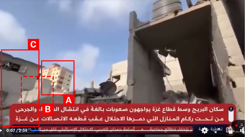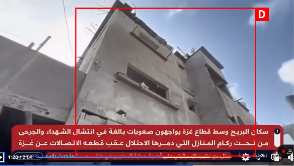 Reports of the incident mention a residential building being struck within Block 7 (قطعة 7) of the Bureij Camp (مخيم البريج). Analysing audio-visual material from sources, we have narrowed the location down to the following exact coordinates: 31.436309, 34.403898.