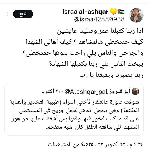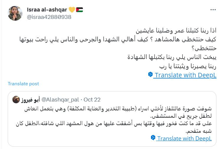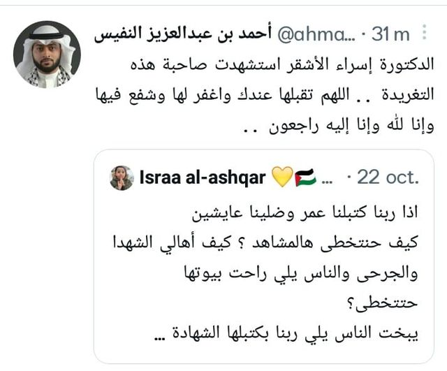 Doaa Ramlawi, meanwhile, wrote that “my relationship with [Dr. Israa Abdullah Mustafa al-Ashqar] was only through Twitter and by God she was like a balm on a wound. I saw nothing but good from her and her treatment was very kind, a conscious, educated person with a degree of respect.”