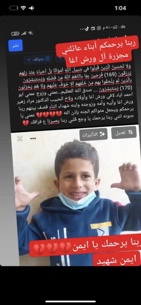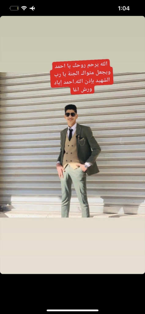 20 year-old Muhammad Hani Nabhan Warsh Agha was one of the victims of the strike. On Facebook, Manar Warshagha shared painful details about his brother Muhammad’s death and the aftermath of the alleged strike that killed him. Manar was “filled with tears and I am saddened by [Muhammad’s] absence. May God give patience to my family with the loss of an entire family.” He prayed that “God [would] have mercy on him, Muhammad Hani Nabhan Warsh Agha.” To Manar, Muhammad was “the best brother and friend.”