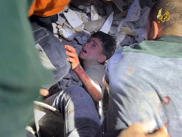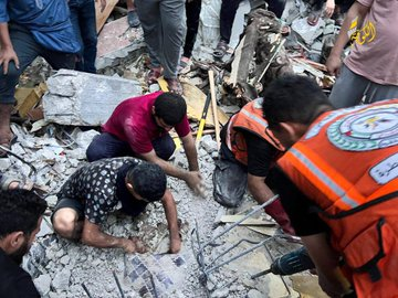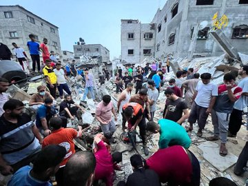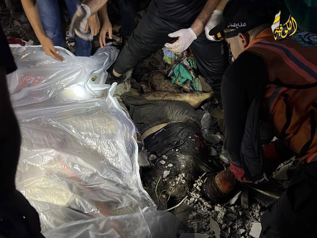 Multiple images shared across social media documented the devastation wrought by the bombardment. Shehab Agency attached photos of volunteers searching through the rubble, including one where a young boy–covered in blood and dust–was being rescued. A video shared by the Palestinian Civil Defence corroborated this, showing the process of uncovering the boy from beneath concrete.