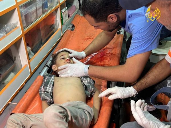Another image shared by the Shehab Agency shows another young boy receiving medical care. His nose is bloodied, and he is lying on a blood-stained stretcher.