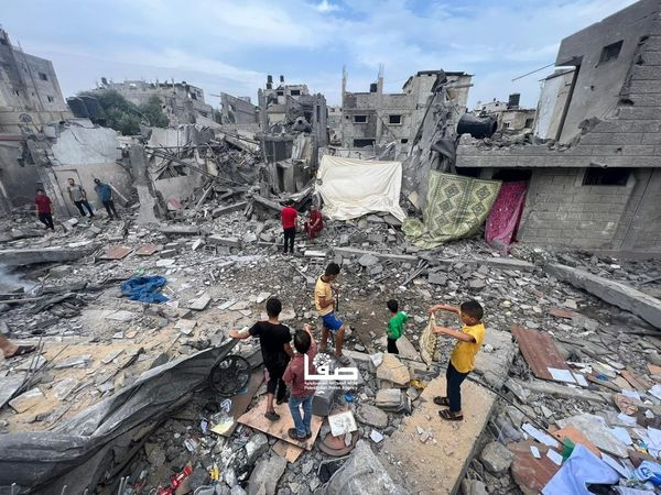 In an image shared by PNN Network, a group of young children are depicted standing on the rubble looking at the victims’ destroyed belongings: furniture, notebooks, clothing and rugs are amongst the debris.