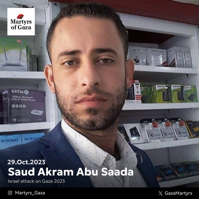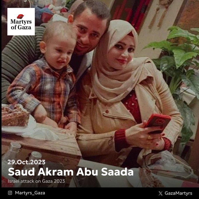 In a December 22, 2023 interview with @GazaMartyrs, Noor Fuad, the surviving wife of Saud Akram Abu Saada, described how on October 29 “their home in Gaza was bombed by Israeli warplanes, and as the rubble fell upon them…[she] carried their son under the debris, desperately calling out for Saud, but there was no response.”