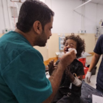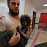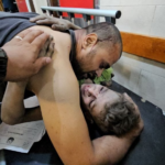 A different set of pictures was widely shared on Facebook. In these images, Ibrahim Nofal can be seen bleeding, followed by him holding his father’s arm with a bandage on his head. Another photo shows an infant lying on a stretcher, embraced by a man. They were both identified in a Facebook post by Hamza.khalil.587 as Riyad (a child) and his father Omar Nofal. Omar Nofal and his son Riyad were also captured in a video posted on Facebook by Al Jazeera Palestine. In the video, an emotional Riyad Nofal can be seen first embracing Omar, and then the younger Riyad, visibly shaken over the stretch. Additionally, photos of at least two other wounded infants were shared as well.