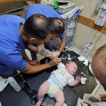 @ShehabAgency posted a series of images showing two infants and a man being carried into the hospital, along with a baby, receiving treatment on a stretcher.