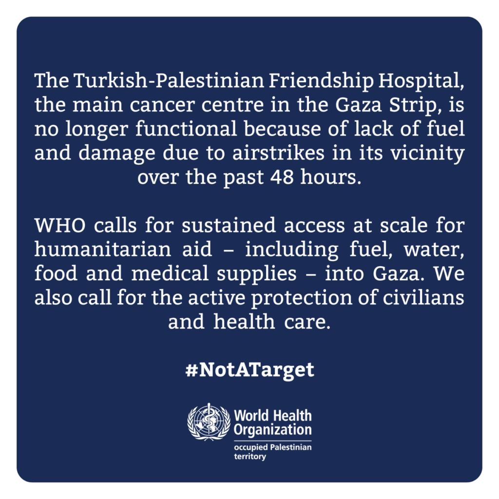 The Turkish-Palestinian Friendship Hospital is one of the largest hospitals in Palestine with an area of 34,800 square metres, three floors, and 180 beds; it also functions as a training center for medical staff. Sources alleged that Israeli forces struck the hospital multiple times: reports published by Quds News, @Refugeesps and Alghad TV indicated that Israeli forces repeatedly bombed the hospital. Fajer TV claimed that this strike was the second.