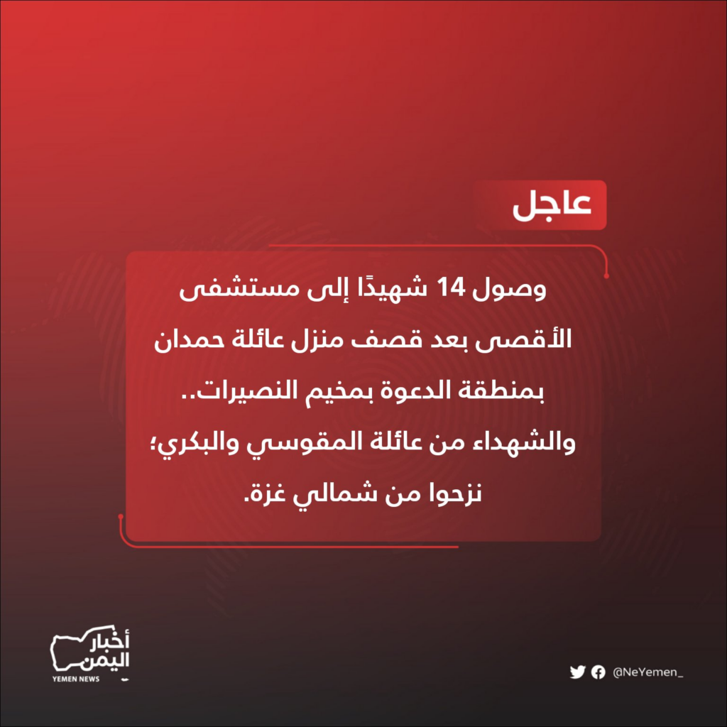 At 8:24 PM on October 30, Palestine Post reported that “14 citizens were martyred this evening, as a result of the targeting of a house in the Nuseirat camp in the central Gaza Strip. The house belongs to the Hamdan family, and it included displaced people from the al-Maqousi and al-Bakri families, who were displaced from the northern Gaza Strip.” According to @klaib94, they had “fled from Shati RC” (al-Shati Refugee Camp). On Twitter/X, multiple sources, including @ShehabAgency, Snd News Agency, @Quds_feed and @YouthGoDigital reported “the arrival of 14 martyrs to al-Aqsa Hospital after the bombing of the Hamdan family’s home.” According to the Nuseirat City Facebook page, the house belonged to “citizen Adnan Hamdan.”