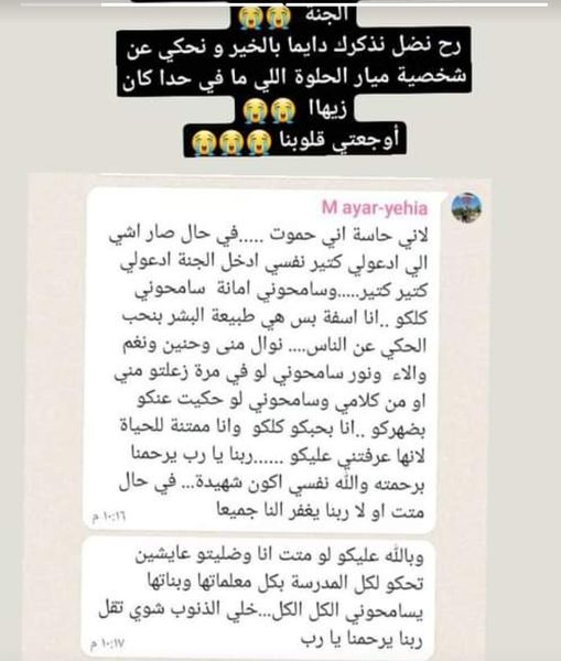 The day after the alleged strike, Taer El-Naurase honored Mayar Joudeh by sharing a video of her standing at a podium and reciting a poem “about Jerusalem as part of the solidarity stand carried out by female students on the school radio.” The Mamdouh Saidam Secondary School for Girls honored Mayar and her sister, Mayas Yahya Jouda, sharing smiling photos of the two girls as well as a screenshot of a heartbreaking message from Mayar in which she wrote about her fear of dying and her final prayers.