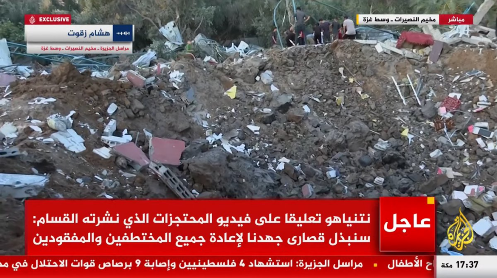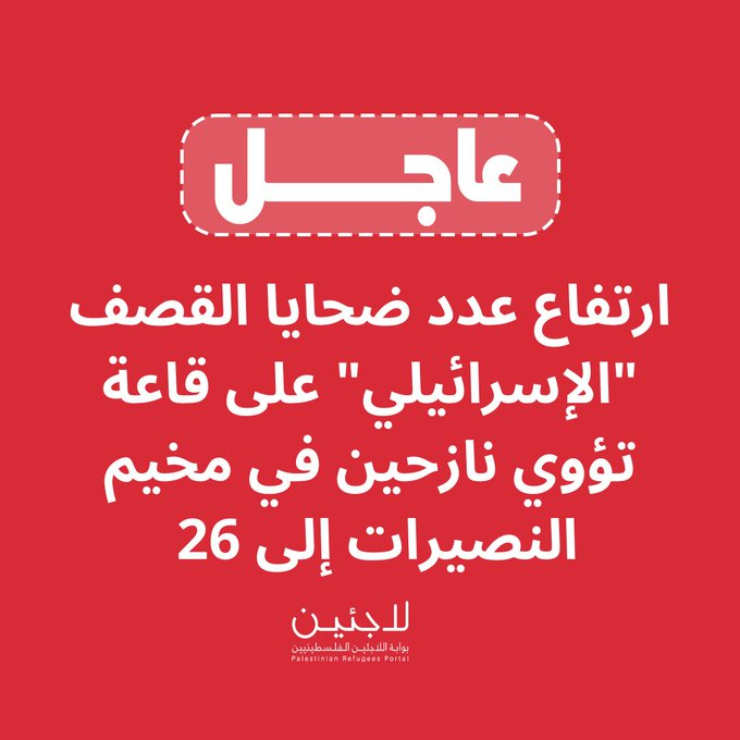 According to Arabi21 News, “Palestinian sources confirmed that [Israeli] aircraft targeted the “Tal al-Qamar” hall in the Nuseirat camp in central Gaza City…The hall was housing dozens of displaced people who took refuge in it, and the new massacre resulted in at least 26 martyrs.” Various other sources reported death tolls ranging from 20-26 people as a result of the alleged Israeli bombing. Twitter/X user @saleemghouri786 however stated that more than 26 people were killed.