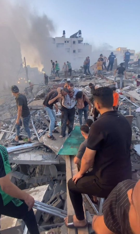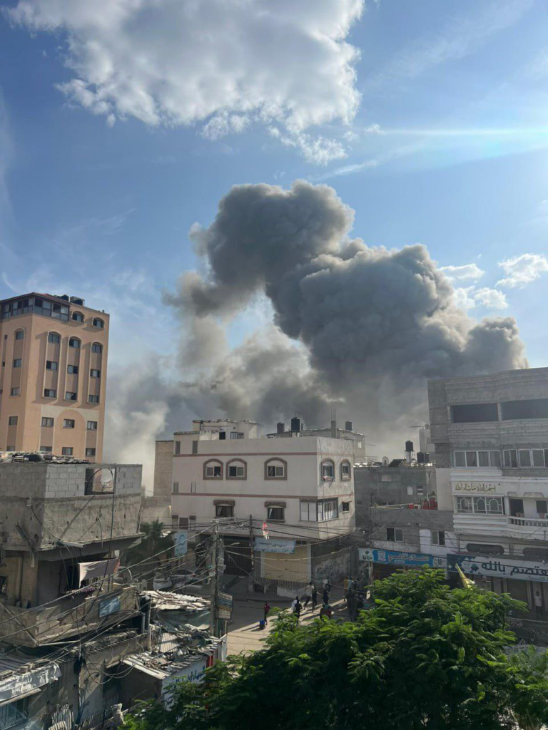 A video tweeted by @ejaznetwork showed at least two plumes of smoke rising from a dense urban area, with the caption reporting “more than 20 martyrs in the [Israeli military’s] targeting of the “Tal al-Qamar” hall.”