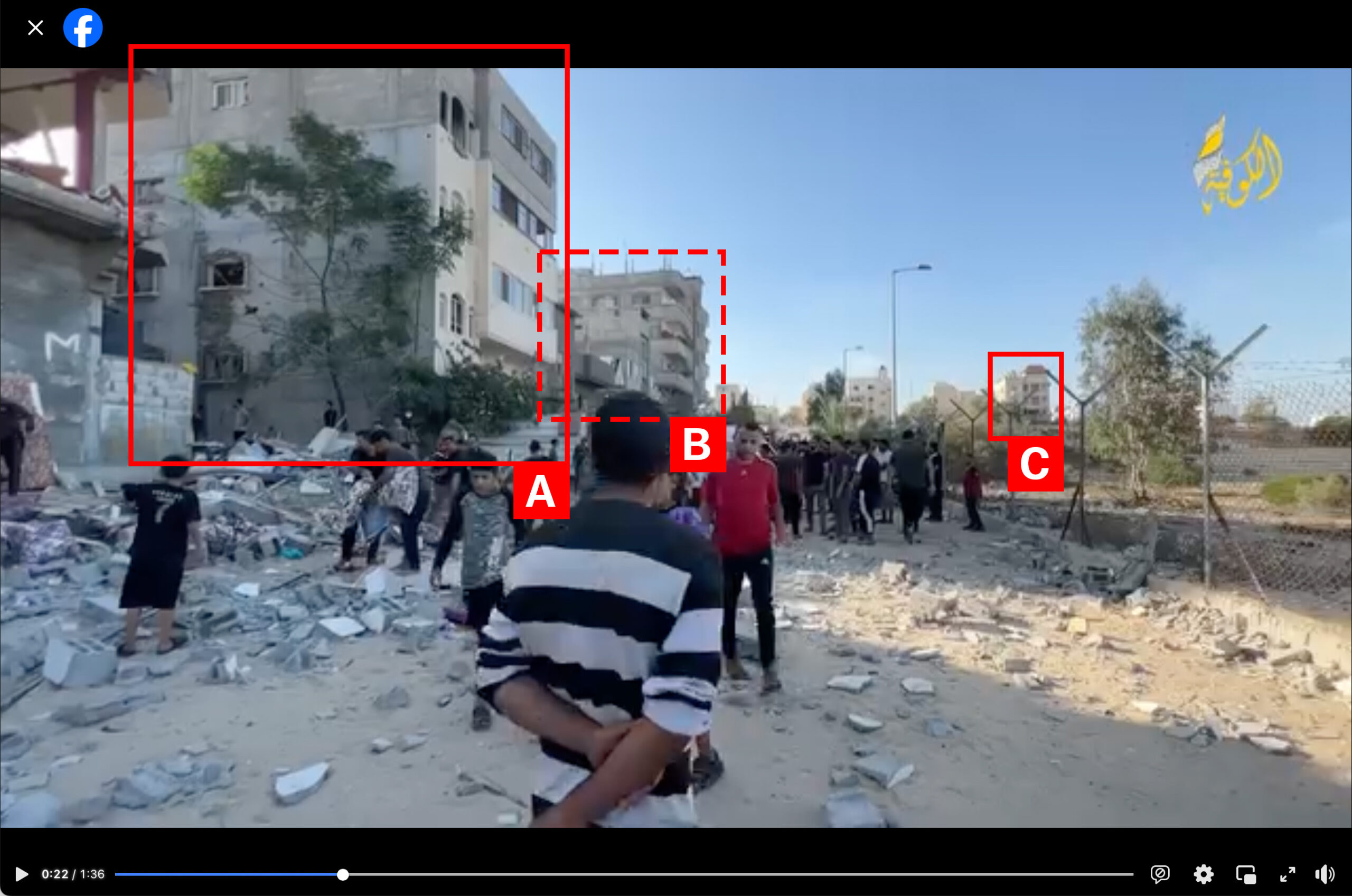 Reports of the incident mention a residential building being struck on Al-Madrasa Street (شارع المدرسة) in the Al-Amal neighbourhood (حي الأمل) to the north of Khan Younis (خان يونس). Analysing audio-visual material from sources, we have narrowed the location down to the following exact coordinates: 31.359681, 34.299785.