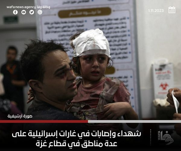 A photo shared by Wafa News illustrated a wounded man carrying a distressed young child who had sustained a severe head injury and had her head bandaged.