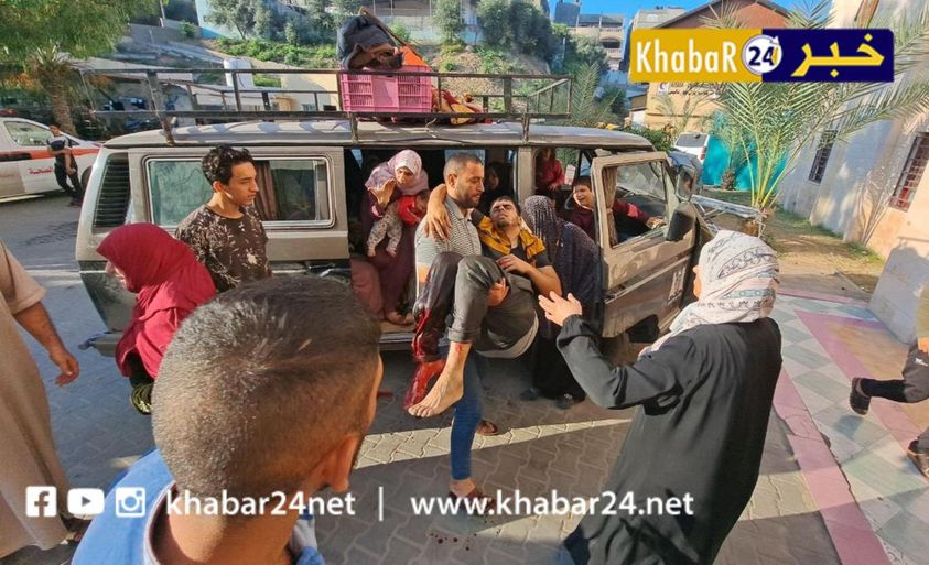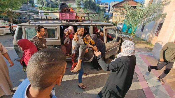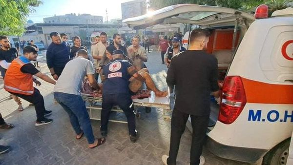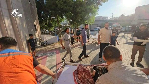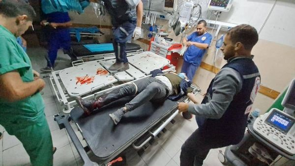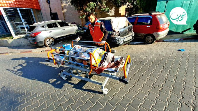 A photo posted by @ShehabAgency, @Yasser_Gaza, @AlQastalps, @Anuarullhaq_kh, Khabar24agency, Ahmadgaza94117, and others shows a group of women and children exiting a small van near the entrance of the Indonesian Hospital as a man in front of them carries in his arms another man with a visible leg injury and significant loss of blood. A photo shared by @PalinfoAr and @paldf shows an emergency worker pushing a stretcher carrying a corpse that was covered in a blanket.
