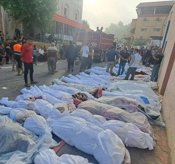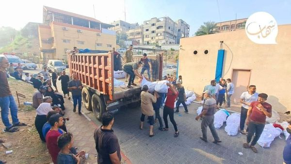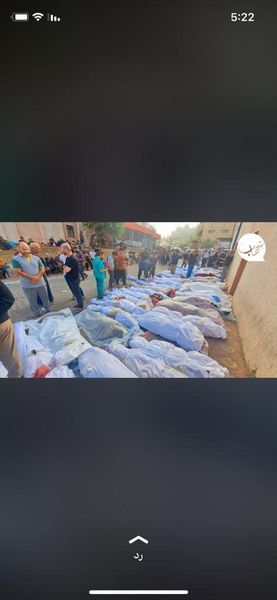 A Facebook page called “‘Gaza Camp Now”’ shared a video attributed to the Palestinian Ministry of Interior (moi.gov.ps) with the caption “The first moments from the site of the targeting of the Shihada “al-Faluja” roundabout in Jabalia camp.” The clip showed dozens of dead and severely wounded people (including many children) arriving at a hospital.