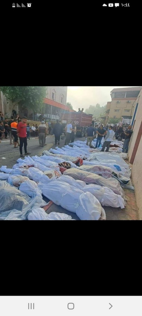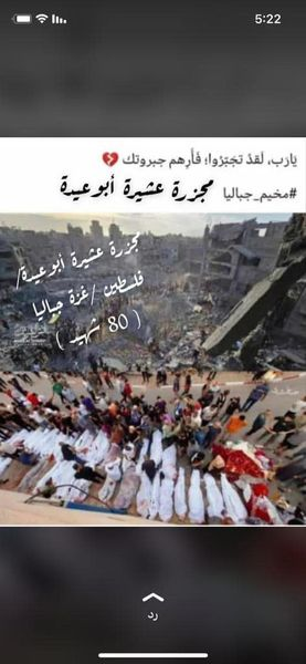 Sharing photos of dozens of shrouded bodies lined up Abu Ziad Abu Yousef and Heba Z Abu Yousef wrote “May God give patience to your heart, my aunt, and give patience to your heart, my mother? Martyrs of Abu Aida.” Um Ahmed Abu Eida also shared a photo of the bodies wrapped in cloth, writing “My family’s martyrs. The Abu Eida family, the Six Martyrs Roundabout, approximately 80 martyrs.”