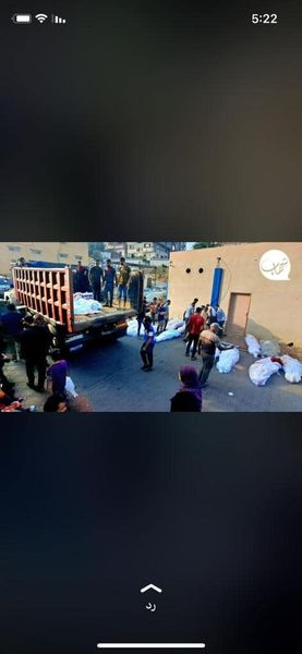 “Photos from the second massacre in the al-Faluja area in Jabalia camp” posted by Awdah.TV show rescuers searching through piles of concrete and personal items in an effort to locate people underneath. In one of the images, two men carrry a shrouded body on a stretcher. In the background, a group of people appears to be tending to another body.