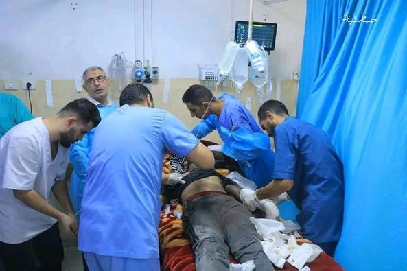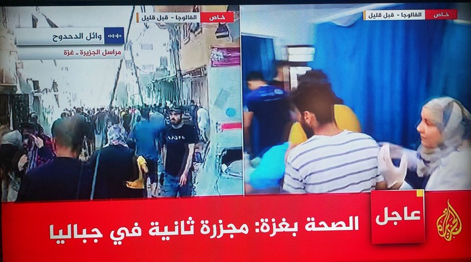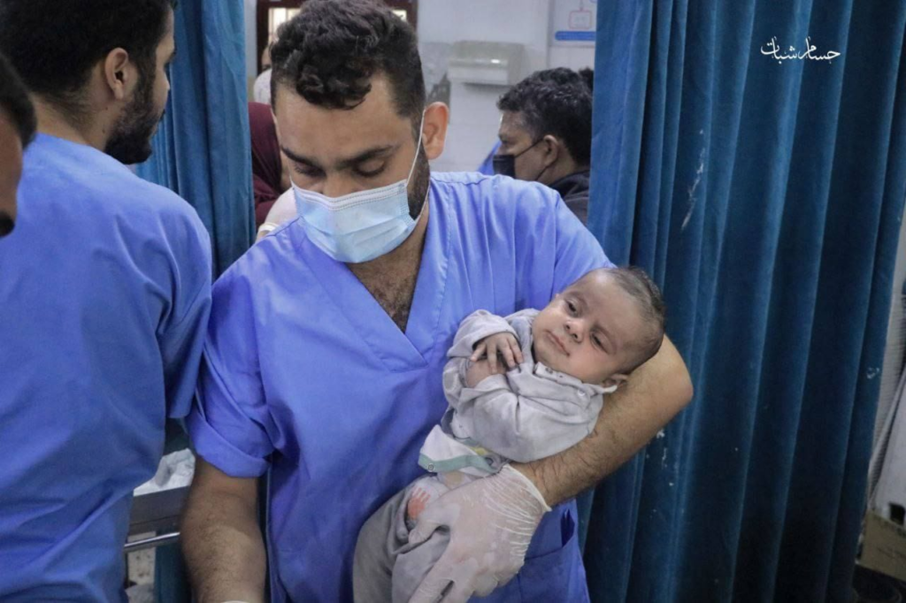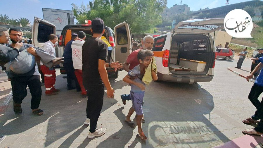 Hasan al-Faqeer drew attention to the repeated bombing of this particular area, writing that “less than 24 hours after the Jabalia camp massacre” adding that “In the al-Faluja area, tons of explosives were thrown on a residential square, and dozens were martyred and wounded.” In his post, Hasan also shared a number of photos of child and infant casualties who were being treated in a hospital, presumably following this strike.